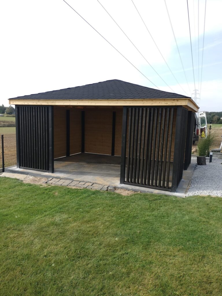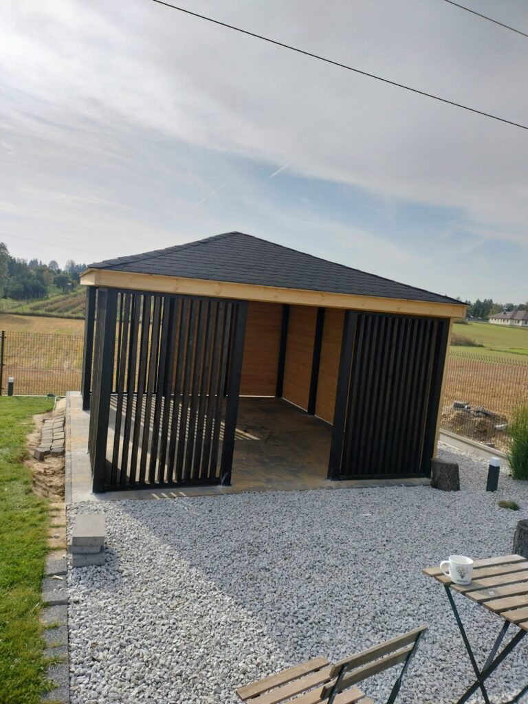 Drewno estońskie > Realizacje > Nowoczesna altana z lamelami w kolorze czarnym